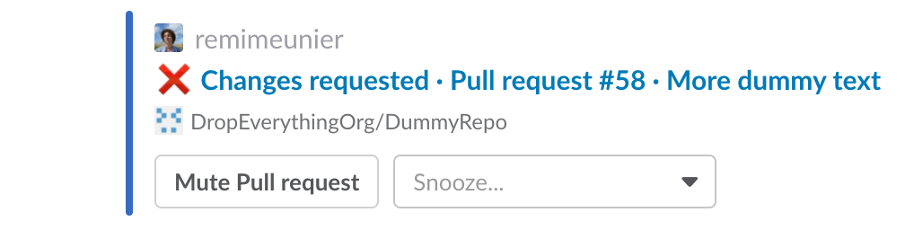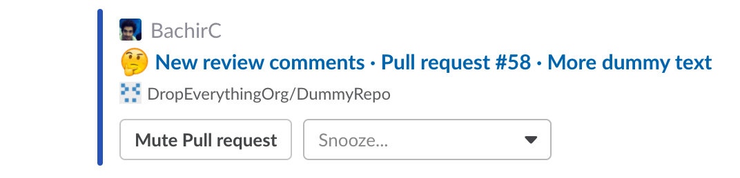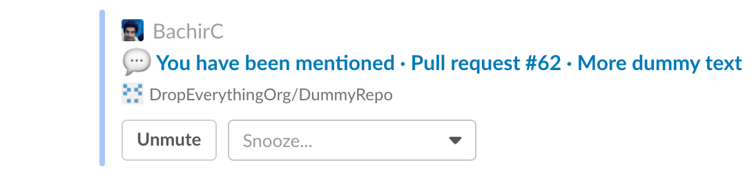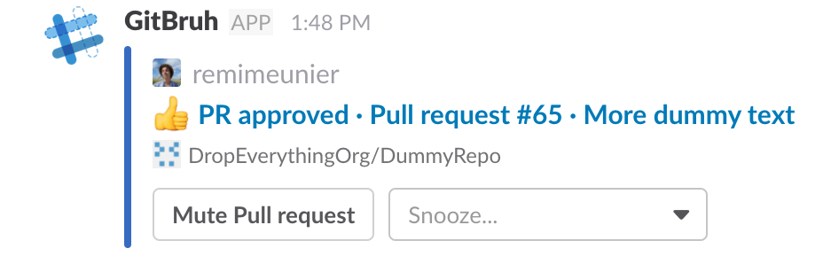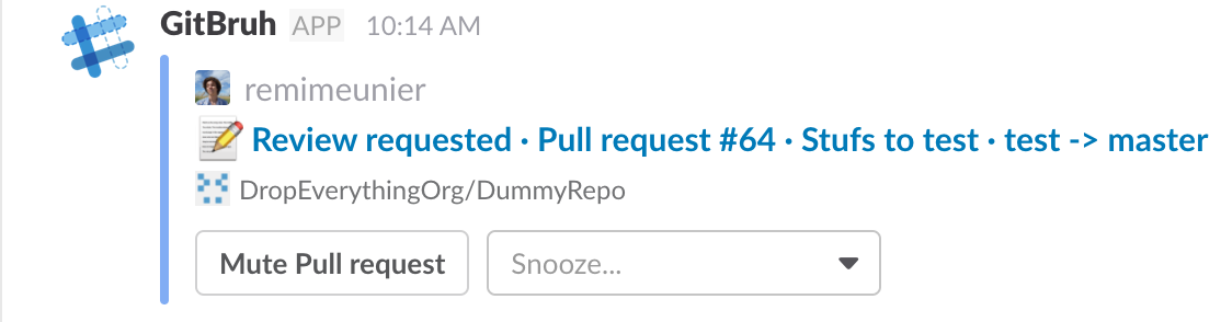 GitBruh leverages a cool feature of Slack API called interactive messages. Broadly, it allows a user to trigger one or multiple actions after receiving a Slack message containing elements for interacting with it (buttons, menus). GitBruh uses this API to allow users to interact with GitBruh messages in Slack by muting/unmuting issues or pull requests, or snoozing messages.